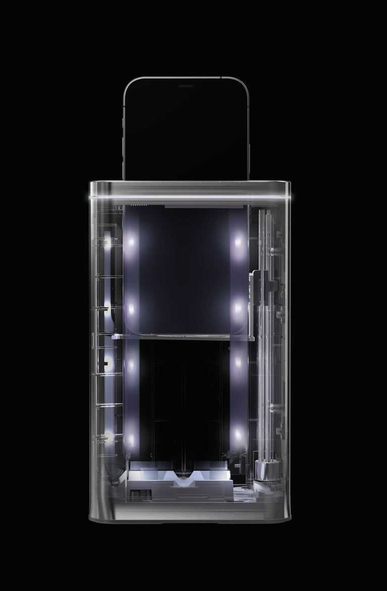 Phone is automatically lowered and raised again when sanitised — all without ever touching the device.