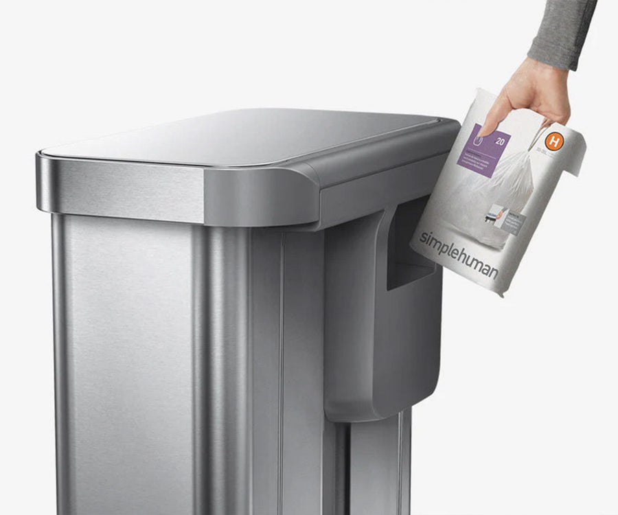 Store liners in the liner pocket, pull a fresh liner out from inside the bin, and close the liner rim to hide the liner and keep it in place.
