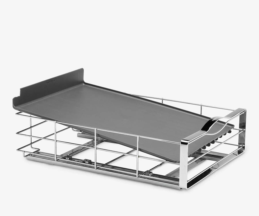 Grab the steel handle to pull the organizer out of the cabinet quickly.