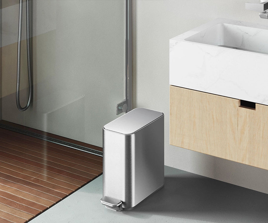 A space-efficient small bin with big bin features and quality. The slim design gives you generous capacity but fits in a tight spot, and the sleek internal hinge allows you to put it flush against the wall.