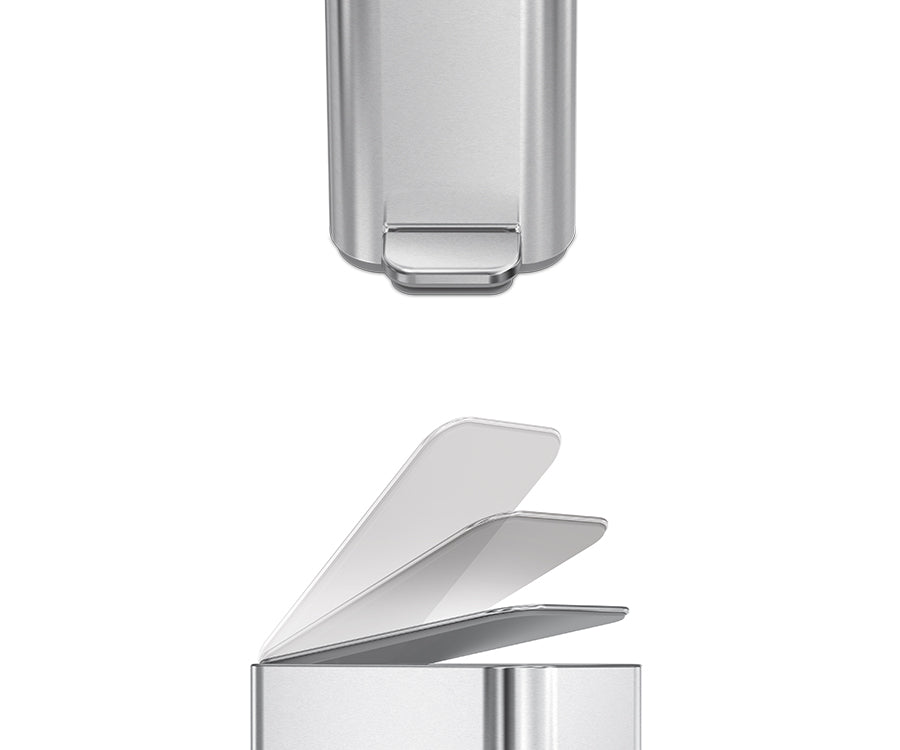 The strong pedal is engineered to last over 150,000 steps — that's more than 20 steps a day for 20 years — and our patented lid shox technology controls the motion of the lid for a slow, silent close.