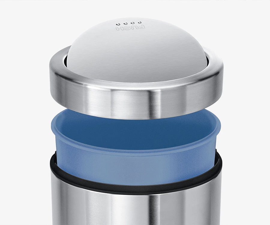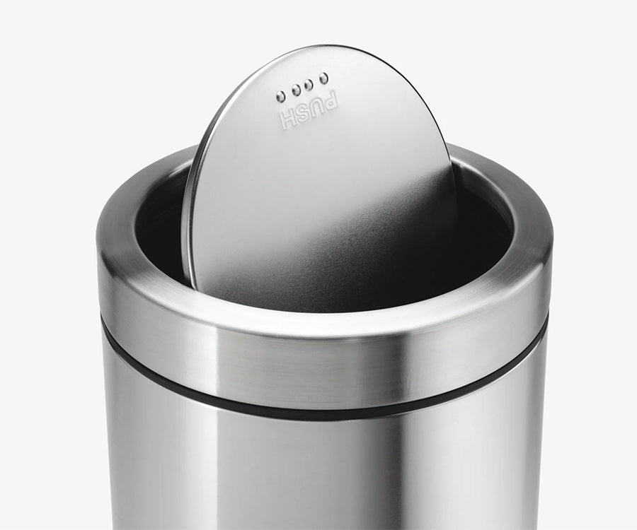 Center-weighted swing lid opens easily and then gently swings back into place.